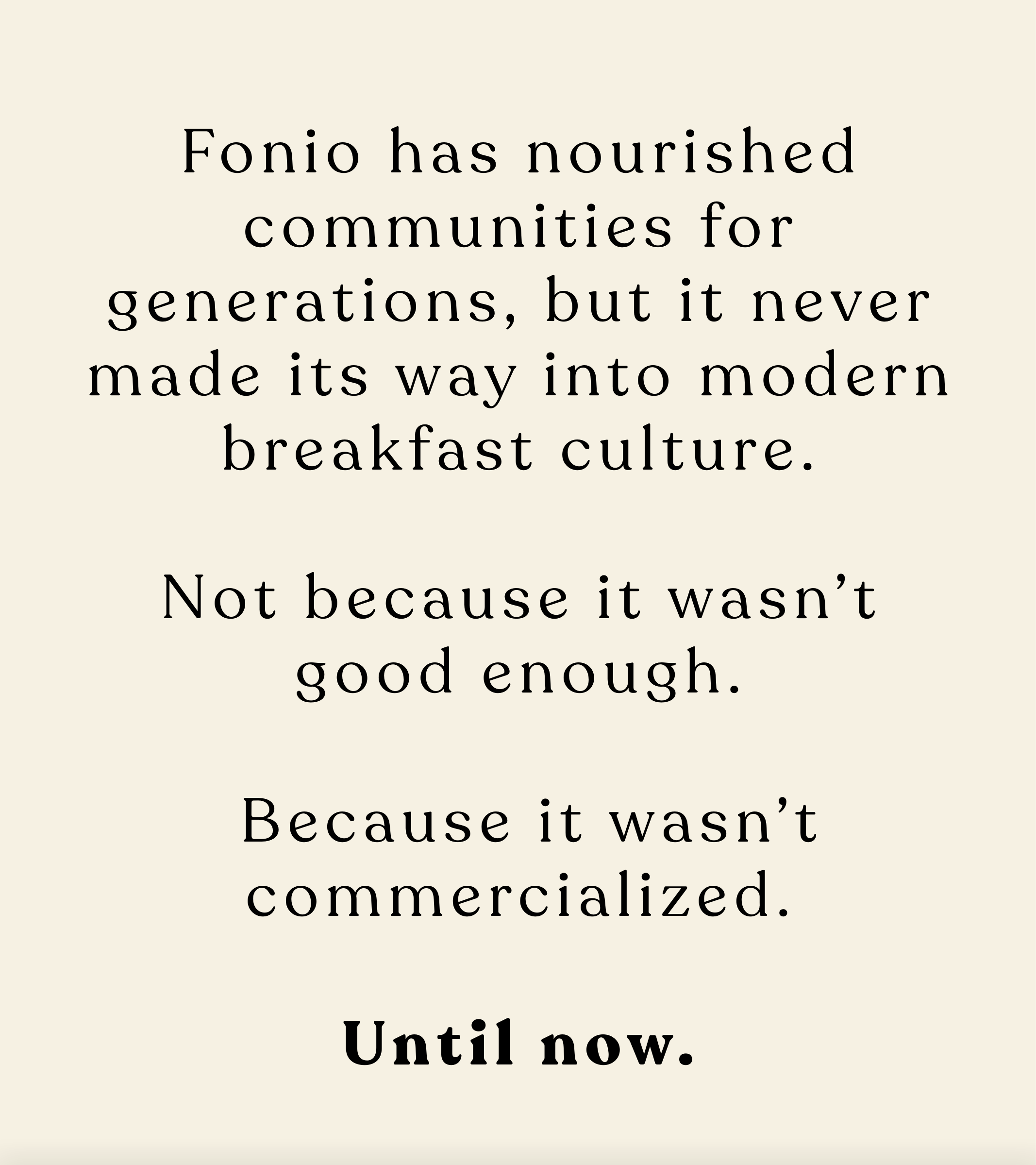 By bringing fonio into a thoughtfully crafted cereal format, we honor its heritage while making it accessible for modern mornings. It’s a quiet return to foods that make sense for the body, prepared in a way that fits real life.